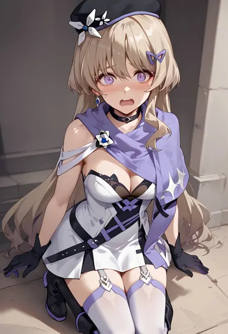 black gloves, black choker, dress, white dress, cleavage, thighhighs, boots, black footwear, purple cape, purple scarf, strapless dress,