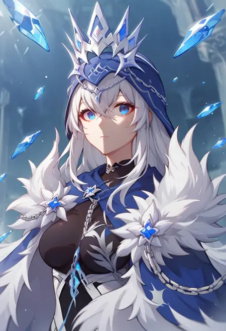 herrscher_of_ice, 1girl, solo, white hair, long hair, breasts, blue eyes, bangs, hair between eyes, fur trim, cloak, cape, fur-trimmed cape, crown, veil, ice, floating, crystal, chain, high heels,