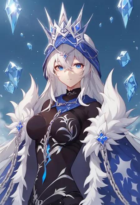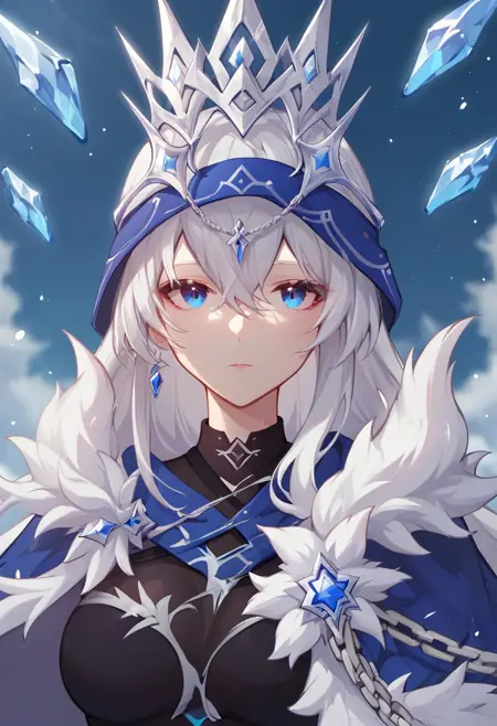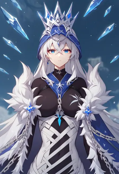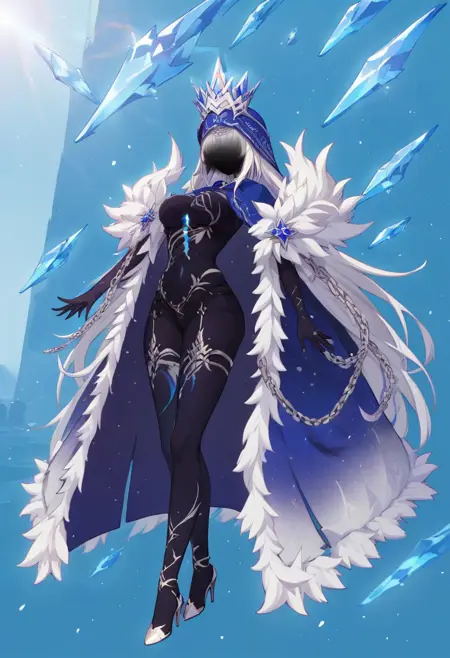 herrscher_of_ice, 1girl, solo, white hair, long hair, breasts, blue eyes, bangs, hair between eyes, fur trim, cloak, cape, fur-trimmed cape, crown, veil, ice, floating, crystal, chain, high heels,