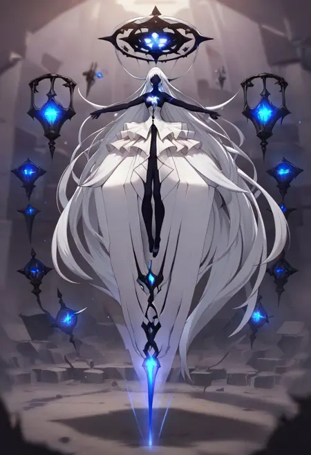 Herrscher_of_the_rimestar, 1girl, solo, very long hair, white hair, dress, floating, floating object, floating weapon, white dress, black skin, chest scar, glowing scar, blue scar, strapless,large skirt,