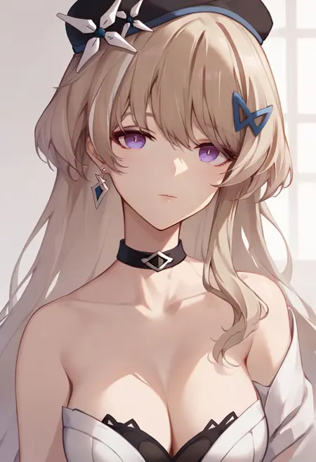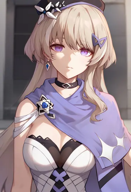 ana_schariac, 1girl, solo, long hair, bangs, purple eyes, breasts, ash blonde hair,