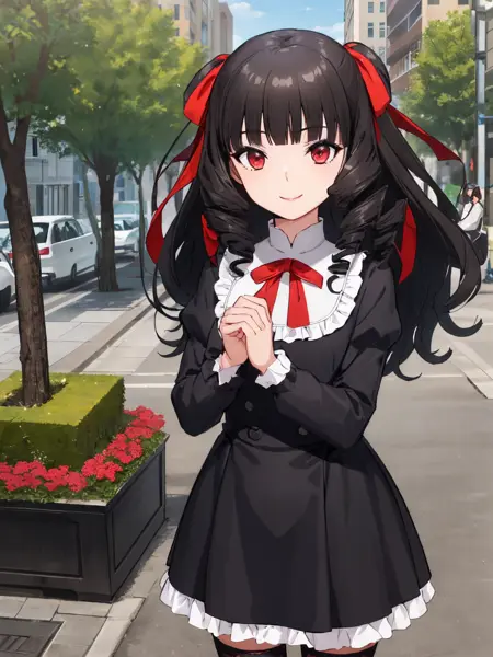 아야코디폴트, 검은 머리, 긴 머리, 드릴 머리, 붉은 눈, 머리 리본, 메이크업