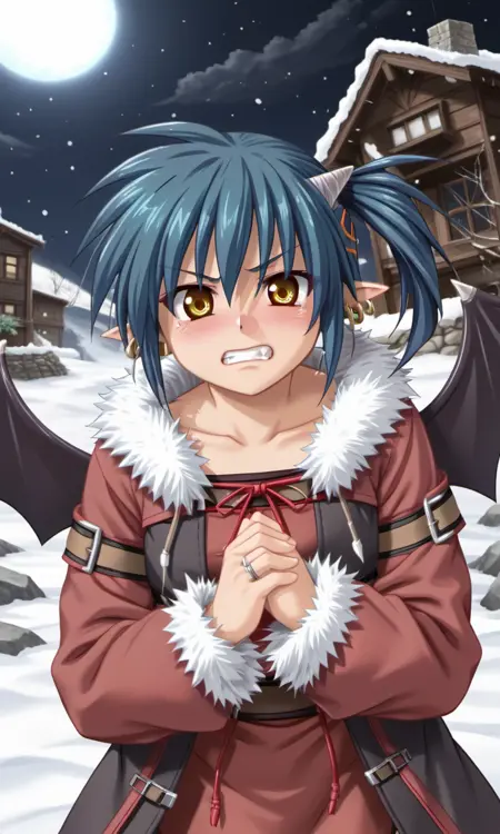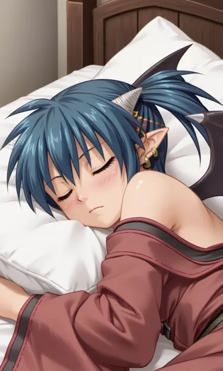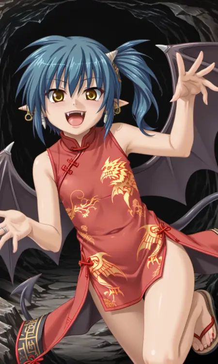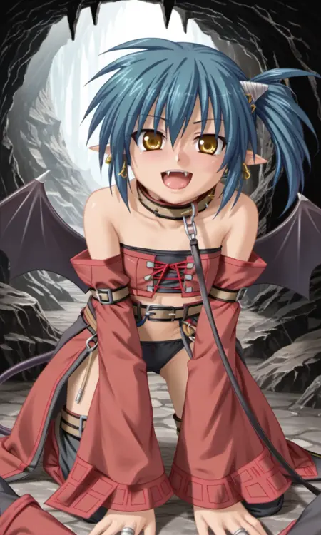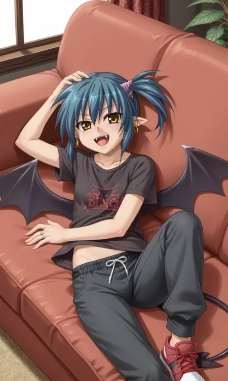 bridget, 1girl, demon girl, horns, yellow eyes, blue hair, short hair, side ponytail, pointy ears, ring earrings, demon wings, demon tail,