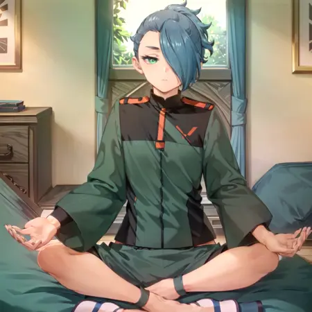 henao, blue hair, green eyes, hair over one eye, ponytail