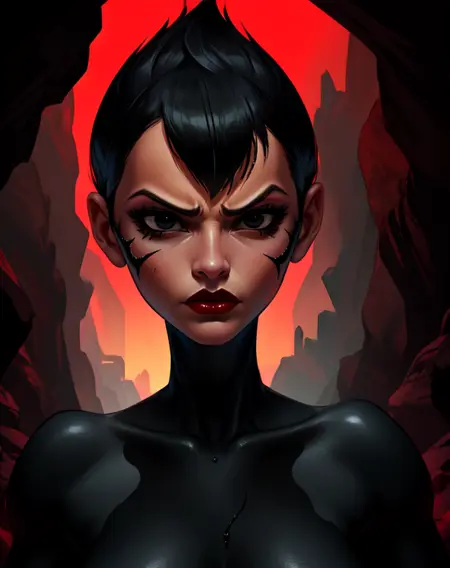 Ashi,黑色短发,尖形头发,红色口红,黑色眼睛,