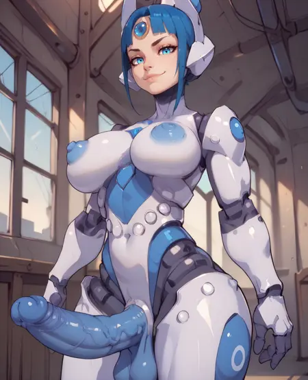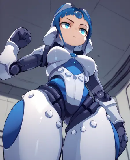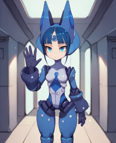 MechaGirl, blue eyes, blue hair, or dark blue hair, blunt bangs,