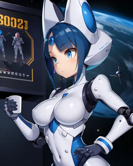 MechaGirl, blue eyes, blue hair, or dark blue hair, blunt bangs,
