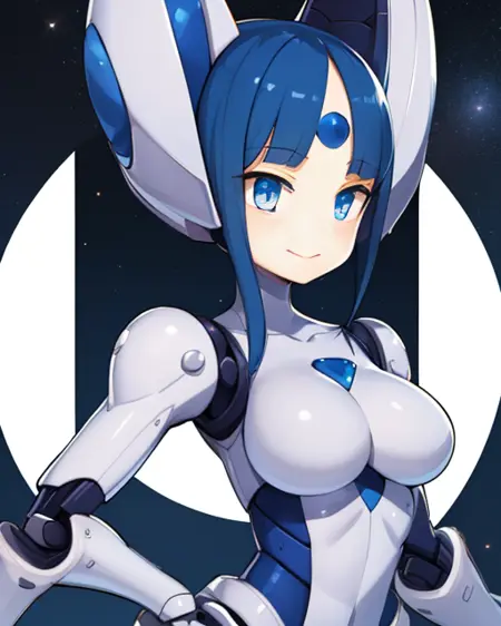 MechaGirl、青い目、青い髪または濃い青い髪、まっすぐな前髪、