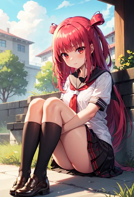 外見タグ:赤い目、赤い髪、長い髪、二つの結び目