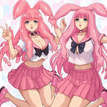 | 训练词汇 | Melona, + +, blue eyes, prehensile hair, long hair, pink hair, blunt bangs, pink rabbit ears, slime girl, hair over breast, 已复制! revealing clothes, see-through clothes, pink shoes, 已复制! school uniform, sailor collar, black bowtie, pleated skirt, pink skirt, choker, midriff, pink footwear, cleavage,已复制! |
