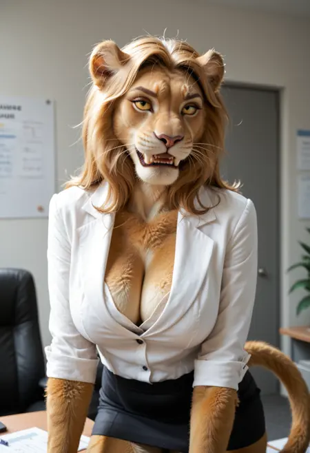 kftenhancer, safe_pos, score_9, score_8_up, score_7_up, 1girl, furry, solo, anthropomorphic lion woman, mature, skinny build, thin, large breasts, office outfit, cleavage, short skirt, seductive look, sharp fangs, tail, biting lip, impending sex, wagging tail, bending over