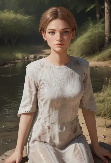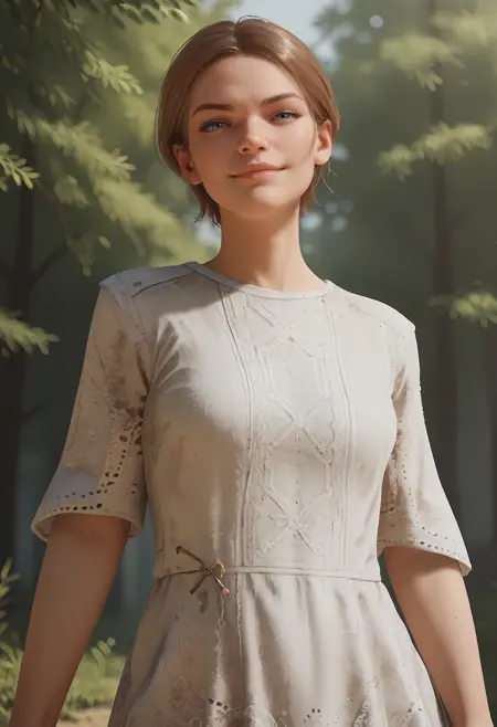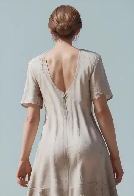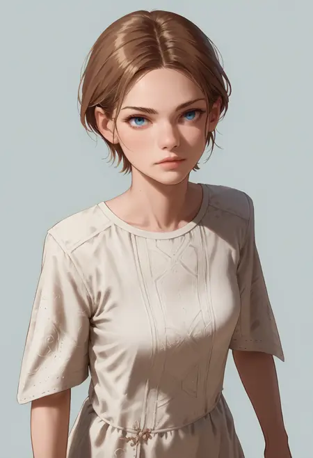 1girl, 棕色头发, 蓝眼睛, 短发, 发髻, 连衣裙, 白色连衣裙, 短袖
