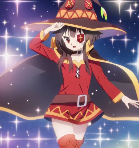 예시: 메구미, 지팡이를 들고, 주문 중, 근접 촬영; 반짝임; 밤;