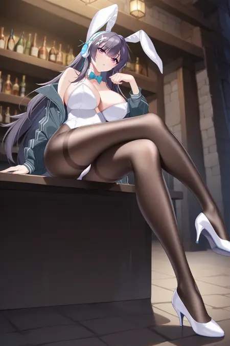 Outfit tag 2 is "reticentbunny, pantyhose, animal ears, playboy bunny, white leotard, leotard, jacket, detached collar, rabbit ears, high heels, fake animal ears, strapless, white heels, strapless leotard, bowtie, bow, "