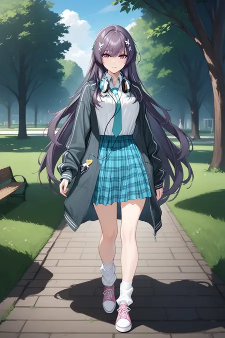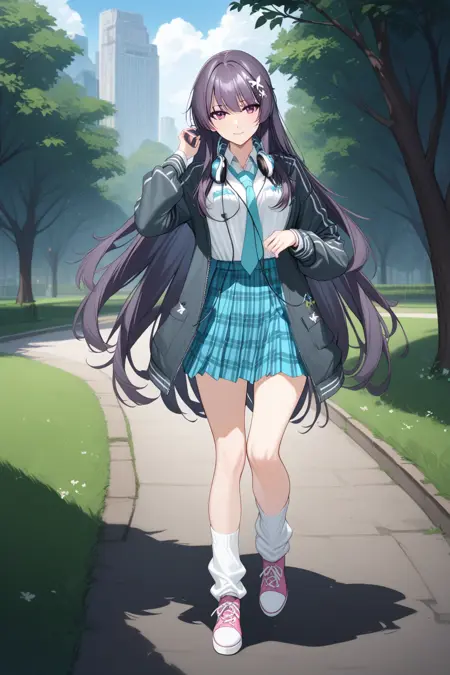 Outfit tag is "defaultoutfit, headphones around neck, skirt, necktie, jacket, shirt, pink shoes, plaid skirt, white shirt, plaid, socks, white socks, loose socks,"