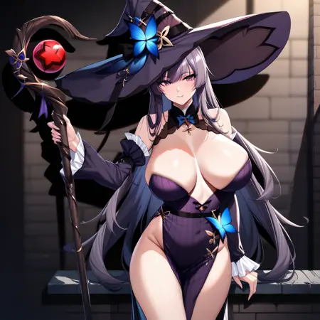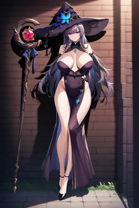 Outfit tag 3 is "violetwitch, witch hat, hat, cleavage, dress, staff, blue butterfly, black heels, gloves, side slit, detached sleeves, bangs, bare shoulders, witch, black gloves, "