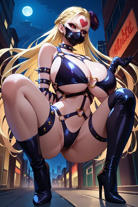 그녀의 전형적인 모습을 위해 "하트, 머리 장식, 검은 꽃, 검은 비키니, 스파이크 칼라, 도미나트릭스, 검은 끈, 하네스, O-링, 팔꿈치 장갑, 단일 장갑, 검은 장갑, 검은 허벅지양말, 비대칭 하의, 허벅지 끈, 하이힐 부츠"를 추가하세요.