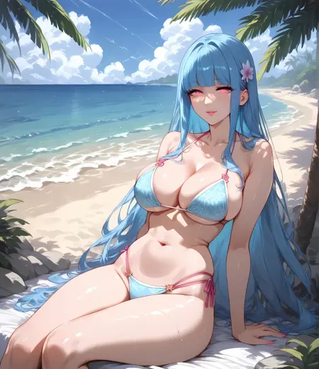 pink eyes, glowing eyes, blue hair, blunt bangs, long hair,