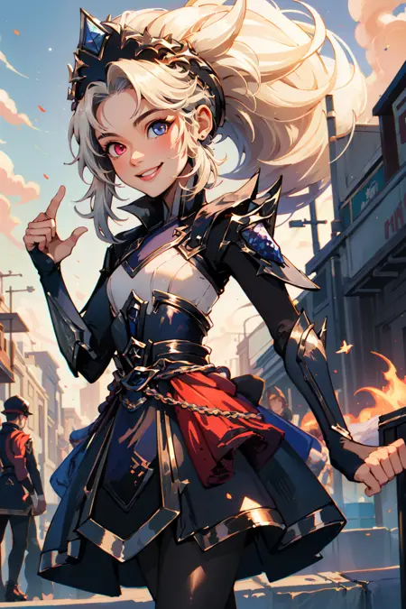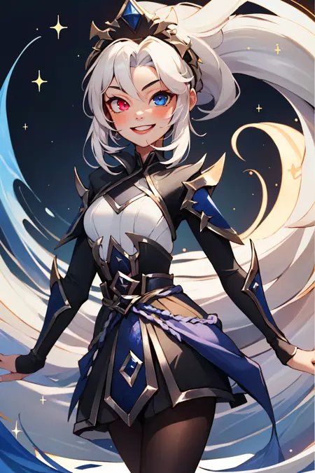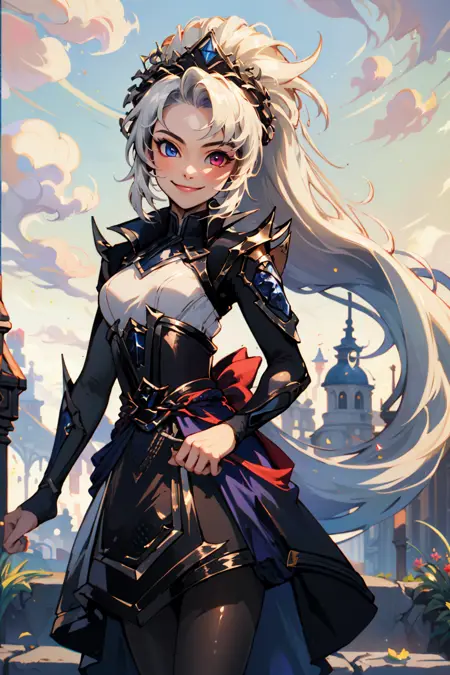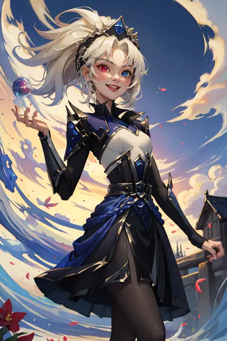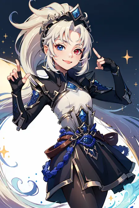 태그: edg zoe, 1girl, 이색 홍채, 짧은 드레스, 검은 드레스, 팬티후스, 매우 긴 머리, 손가락 없는 장갑