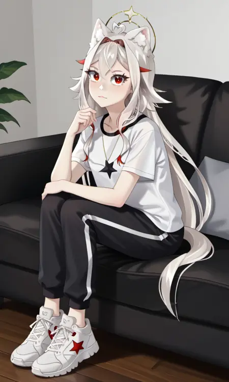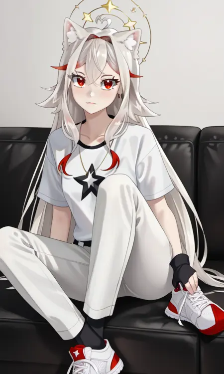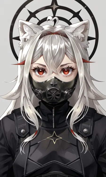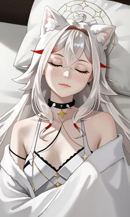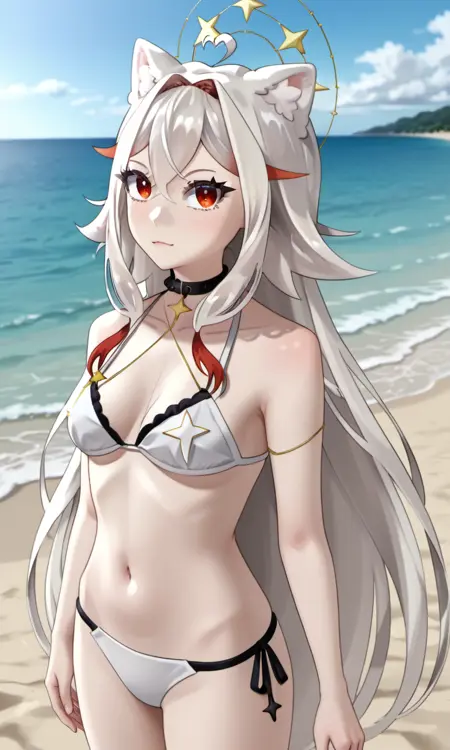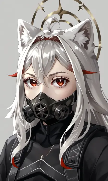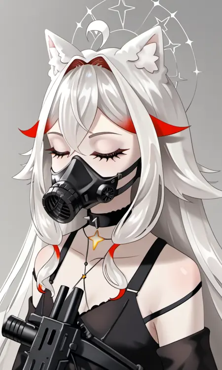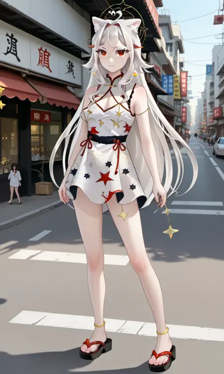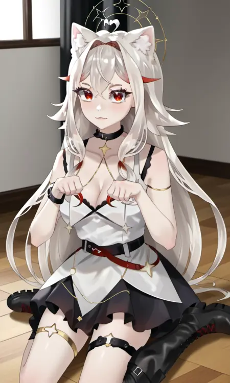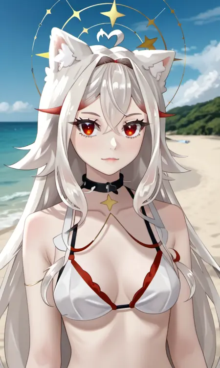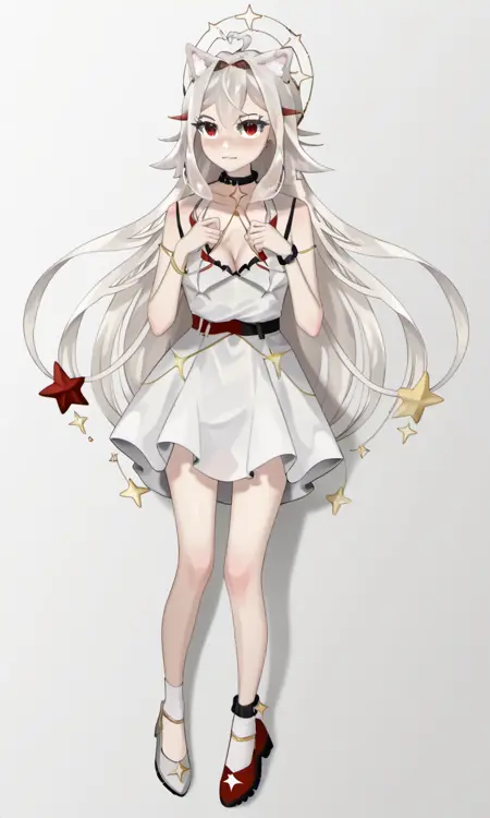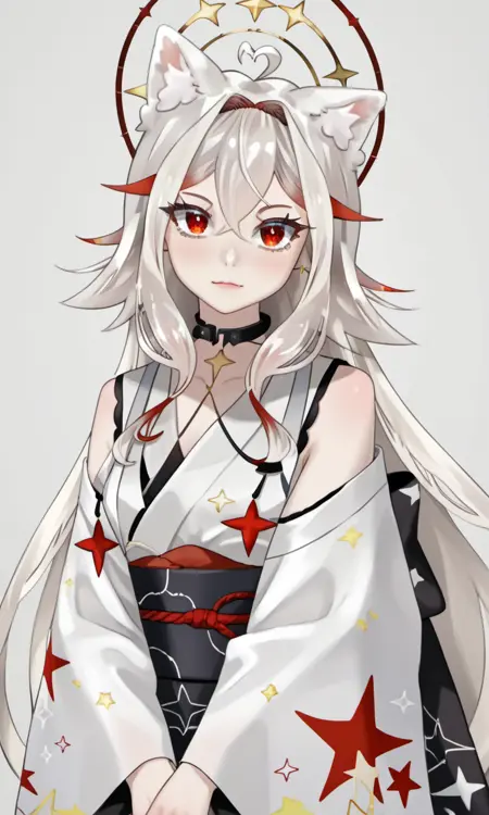 AlaskaNyan, 1girl, red eyes, silver hair, long hair, ahoge, hair flaps, hair between eyes, animal ears, star choker, star earrings,
