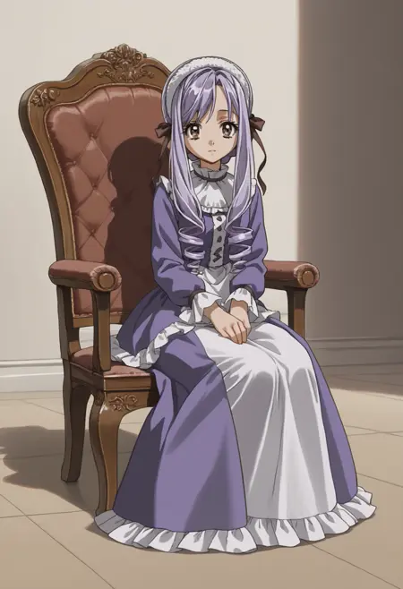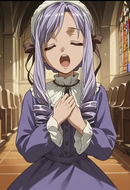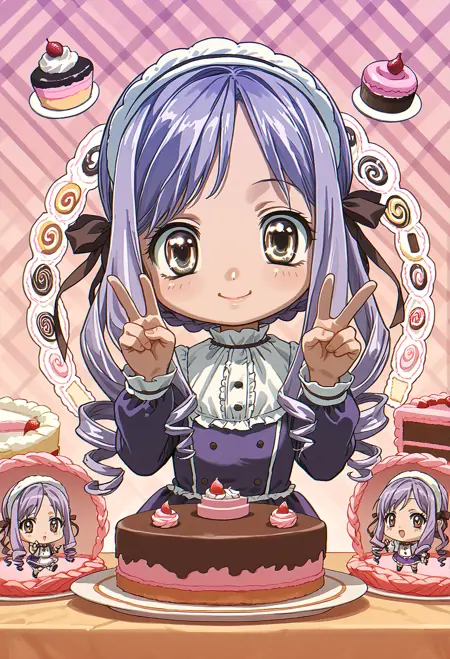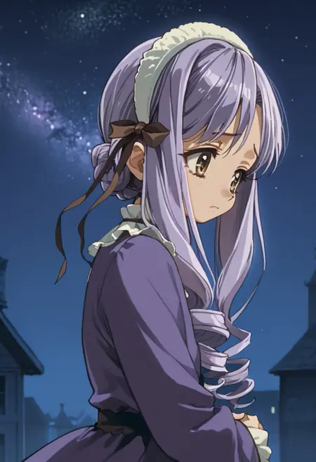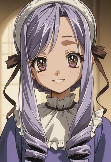 s_4r14, headdress, purple hair, drill hair, braid, hair ribbon, brown eyes