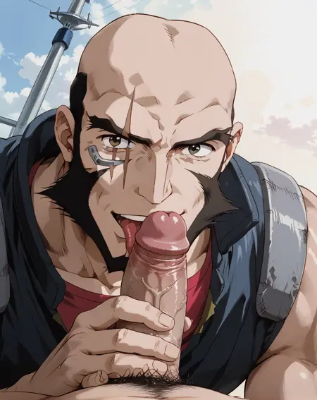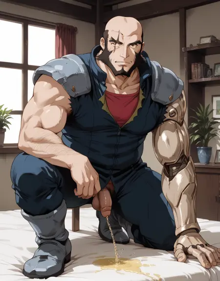 trigger:(jet black:1.2),単一の機械腕、薄い上部の髪、顔の髭、あごひげ、メタルアイ、目の横の傷、肩パッド、カバーオール、赤いベスト、bara