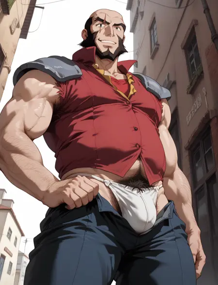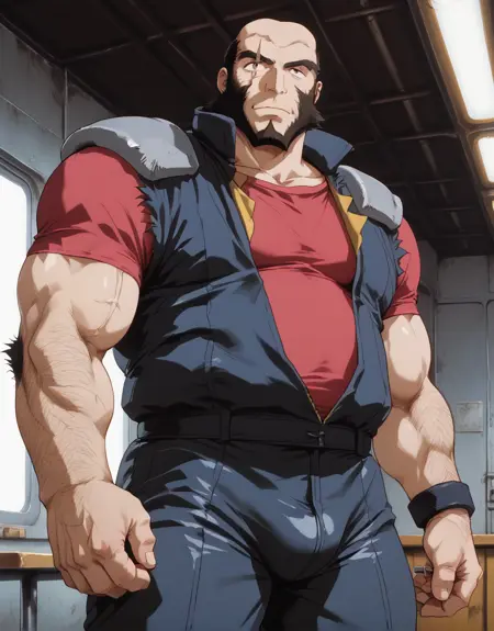 (jet black:1.2),single mechanical arm,thin on top hair,facial hair,sideburns,eye metal,scar across eye,shoulder pads,coveralls,red vest,bara