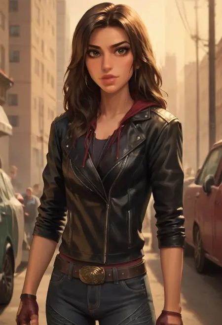 가죽 자켓, 후드 내려짐, 검은색 셔츠, 손가락 없는 장갑, 벨트 버클, 청바지, 부츠