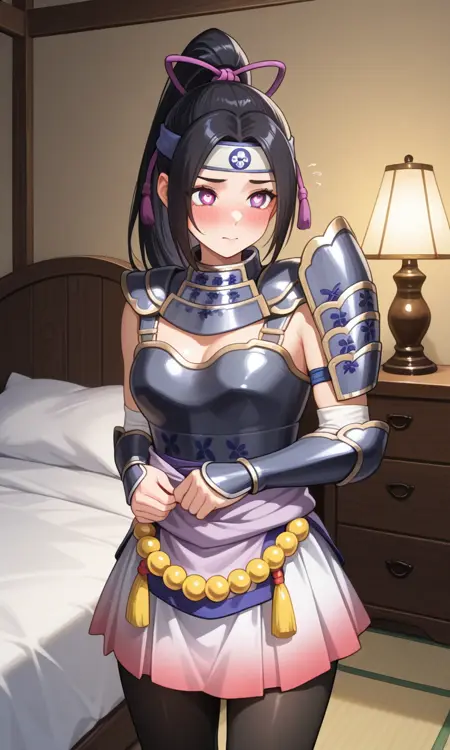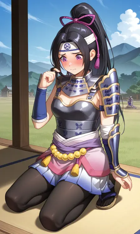 Inahime, black hair, high ponytail, headband, purple eyes, samurai armor, collar guard, shoulder guard, arm guard, gauntlet, skirt, prayer beads around hip, black pantyhose, shin guard, sandal
