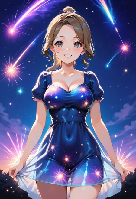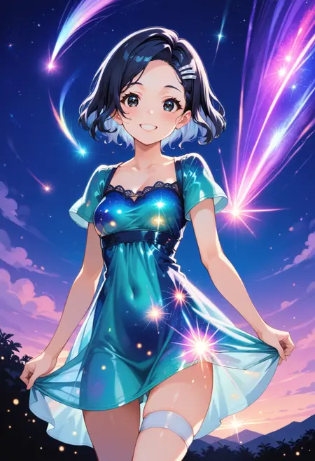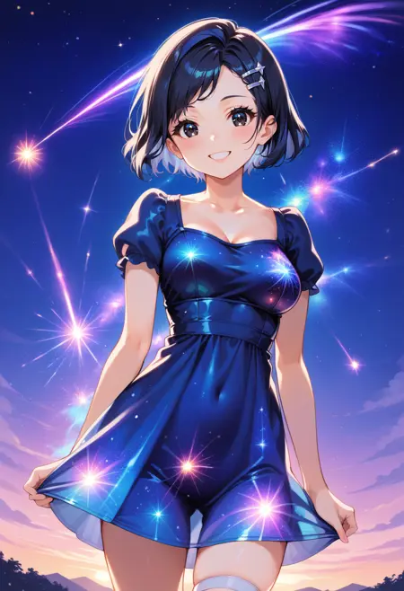 推奨ワード: starry night, starry background, star, {color_name} dress, aetherical