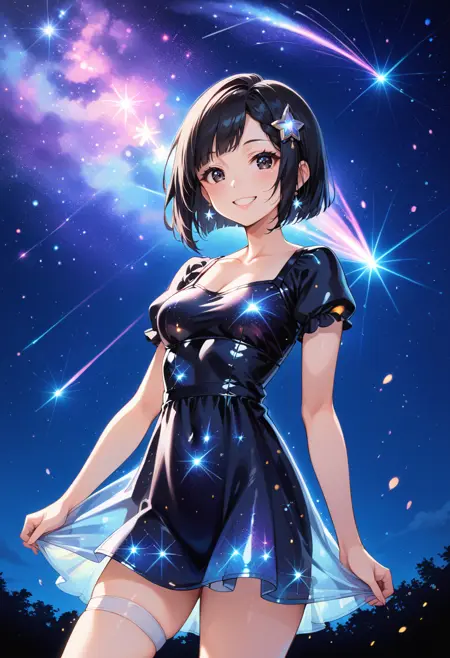 推奨ワード: starry night, starry background, star, {color_name} dress, aetherical