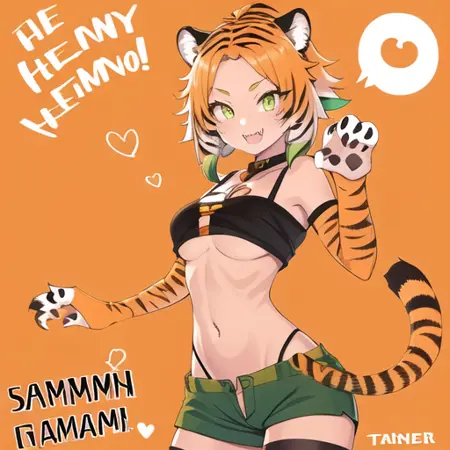 좋은 이미지를 생성하는 태그는 다음과 같습니다: 1 girl, samia, 다른 색상의 머리카락, 주황색 머리카락, 머리카락에 흰색 테두리, 검은색 머리카락, 호랑이 귀, 녹색 눈, 애니메이션 스타일, 인간의 얼굴.