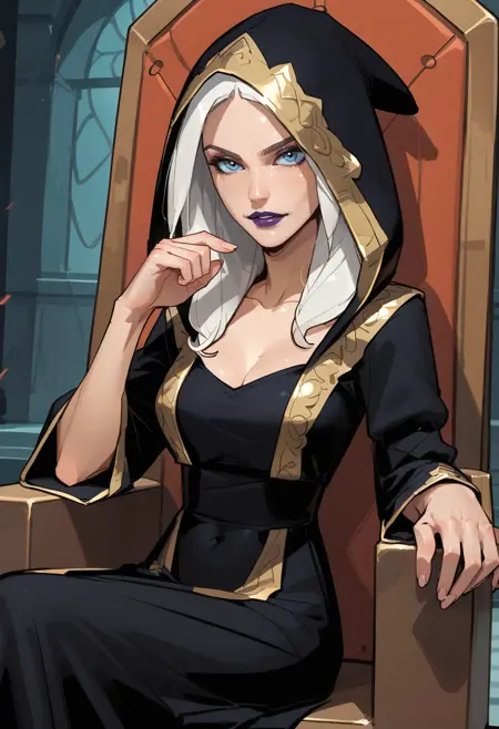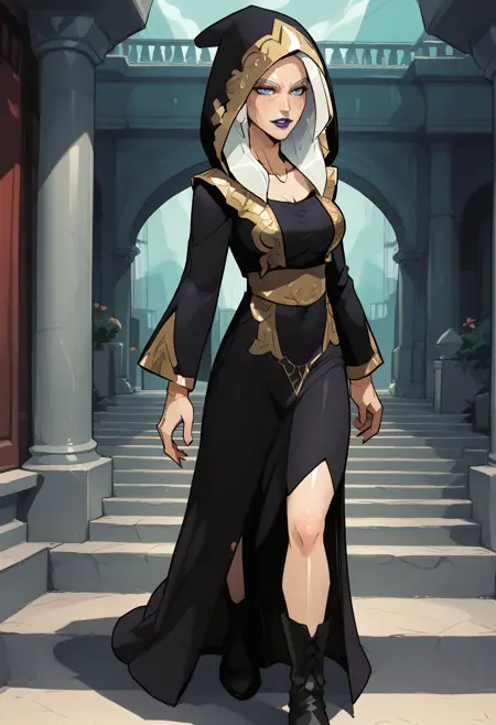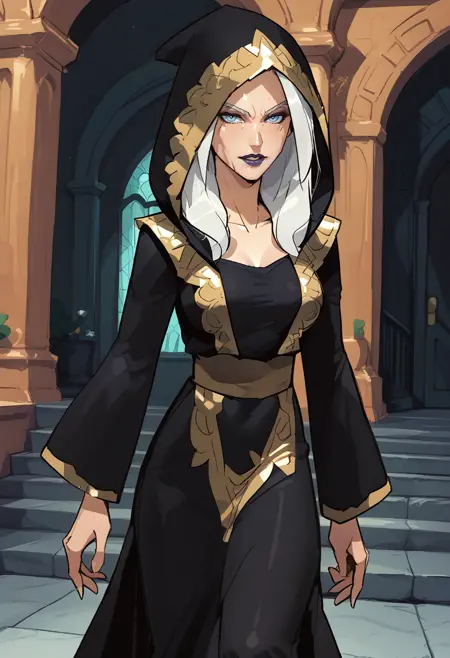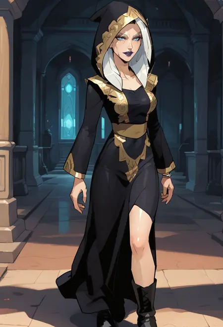 권장 태그: 흰 머리, 긴 머리, 큰 가슴, 배꼽, 메이크업, 립스틱, 어두운 드레스, 보석, 후드, 측면 슬릿, 유두 노출, 부츠, 팔찌,