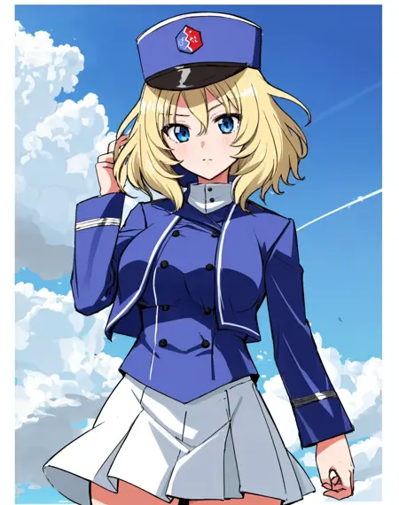 彼女の服装:BC Freedom軍服、帽子、白いスカート、ブーツ、
