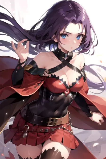 TangRouSoftMist, 1girl, solo, black thighhighs, very long hair, blue eyes, cleavage, medium breasts, black leotard, showgirl skirt, purple hair, belt, waist cape, bare shoulders, collarbone, red skirt