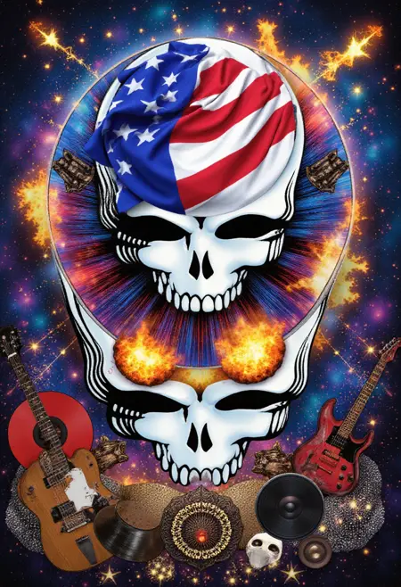 感恩死者乐队(The Grateful Dead)的“Steal Your Face”标志,常被称为“Stealie”,是摇滚乐史上最具标志性的符号之一。该标志由艺术家Owsley “Bear” Stanley和设计师Bob Thomas创作,于1969年首次亮相。最初,它的设计目的是为了在音乐会和音乐节的混乱环境中,为乐队的设备箱提供一个醒目易辨的标记。设计图案由红、白、蓝三色的闪电贯穿一个风格化的骷髅头,象征着乐队的迷幻本质及其与美国反文化运动的联系。