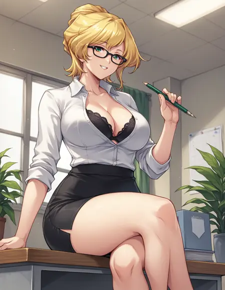 eliza britain, blonde hair, short hair, single hair bun, green hairband, hair ribbon, green eyes