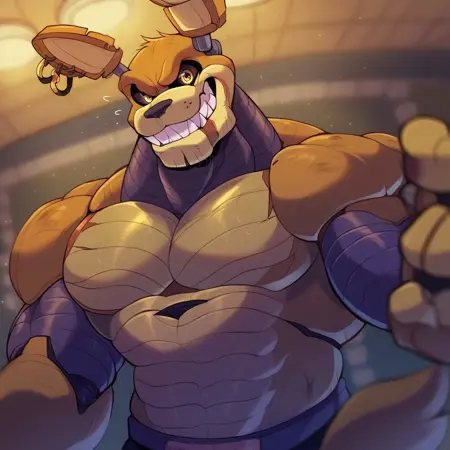 by e-zoid / k-jukes, furry, furry male, anthro, rockstar freddy (fnaf), five nights at freddy's, five nights at freddy's: security breach, animatronic, bear, robot, robot anthro, hat, headgear, headwear, machine, male, muscular, muscular anthro, muscular male, shoulder pads, yellow body