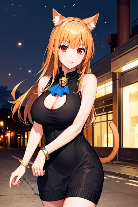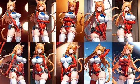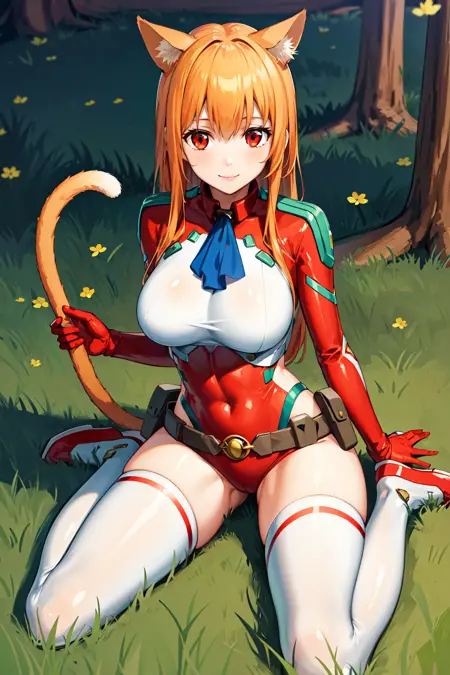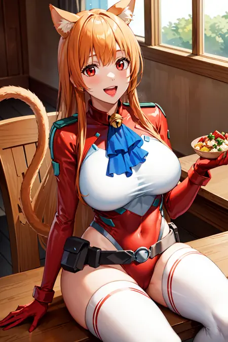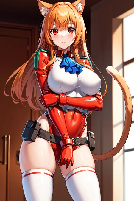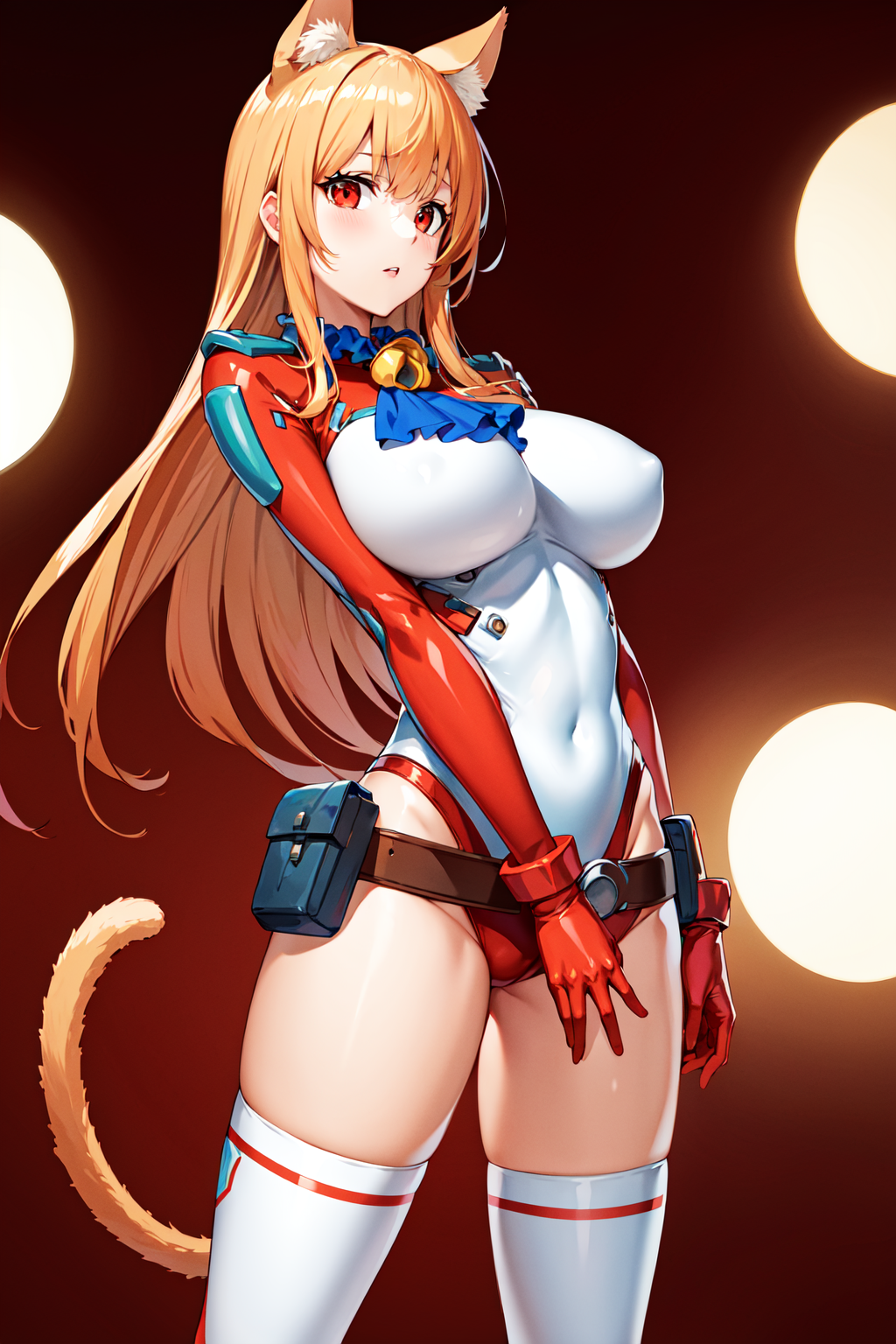 outfit1hmeris, orange hair, red eyes, cat ears, cat tail, large breasts, red leotard, blue ascot, jingle bell, long sleeves, white thighhighs, loose belt, pouch, red gloves