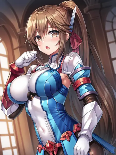 ☆ 핵심 키워드: saionjireimi, 갈색머리, 갈색눈, 갑옷, 바디수트, 흰색 팔장갑, 보라색 하의