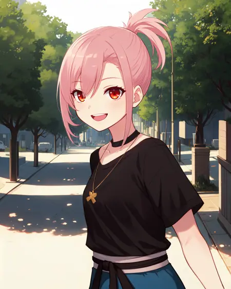Appearance: pink hair, red eyes
