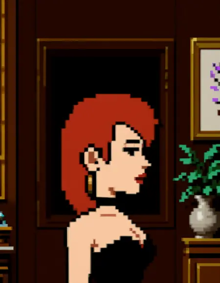 pixelart, MM_Razor, 1girl, red hair, swept bangs, straight hair, razored hair, medium hair, asymmetrical hair, black eyes, breasts, cleavage, punk, jewelry, single hoop earring, black bracelets, makeup, red lipstick, red nail polish, black choker, black dress, slit dress, bare shoulders, black high heels, full body, closed mouth, indoors, front facing,
