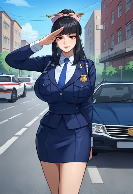 black hair, ponytail, hair bow, hair stick, brown eyes,Police girl: