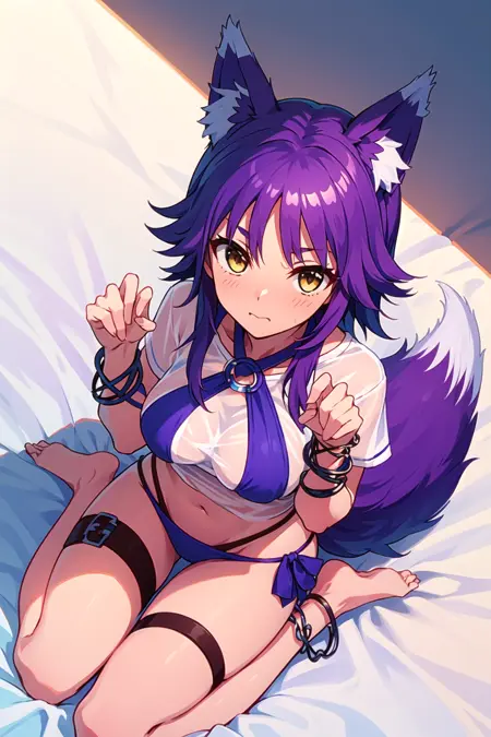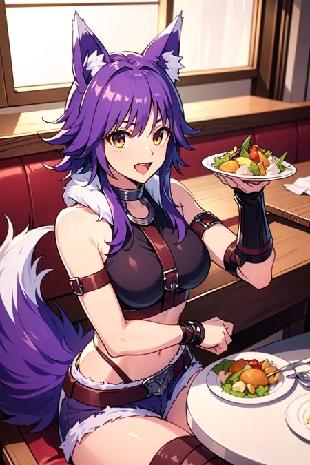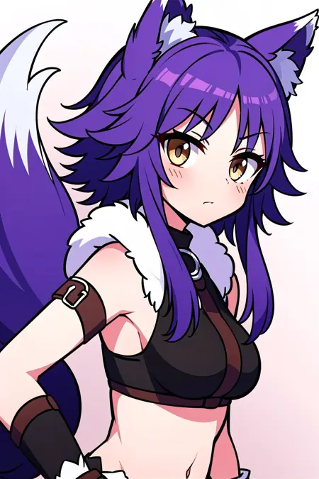 Default outfit: metal collar, crop top, bare shoulders, arm belt, bracers, purple short shorts, belt, fur trim, thigh belt,