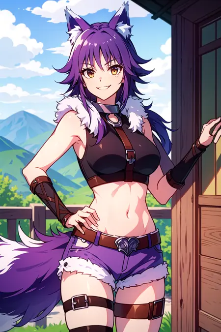 默认服装:金属项圈, 露腹上衣, 裸露肩膀, 手臂束带, 护臂, 紫色短裤, 腰带, 毛皮镶边, 大腿束带