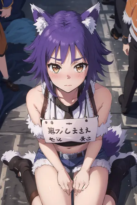 Default outfit: makotodefault, metal collar, crop top, bare shoulders, arm belt, bracers, purple short shorts, belt, fur trim, thigh belt,