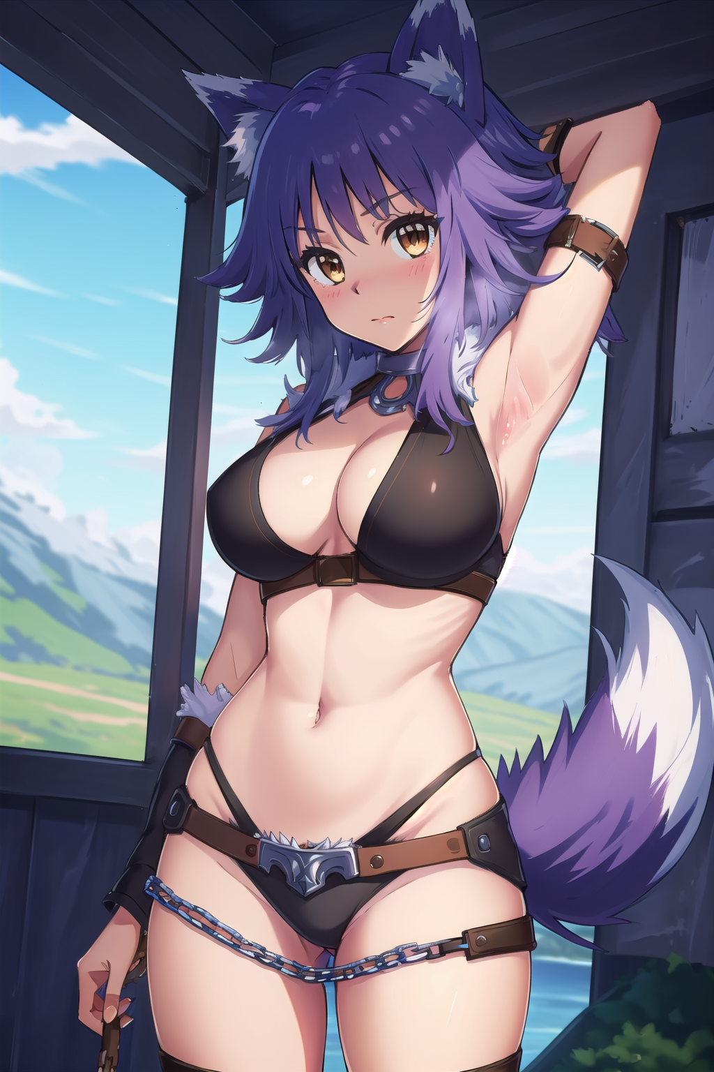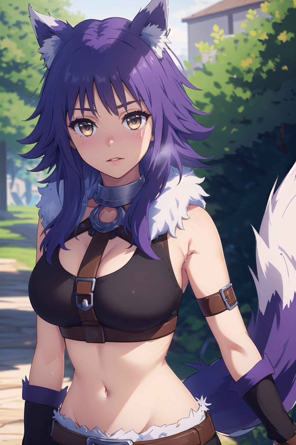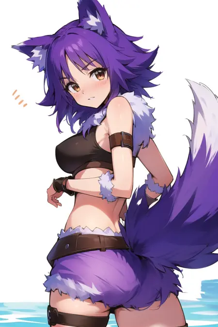 Default outfit: metal collar, crop top, bare shoulders, arm belt, bracers, purple short shorts, belt, fur trim, thigh belt,