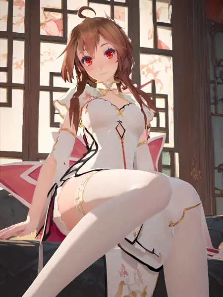 lora:YueZhengLing\_FangZhou\_Illustrious:1, YueZhengLing, red eyes, brown hair, ahoge, long hair,bangs, hair ornament, chinese clothes, dress,long sleeves glove, white thighhighs, high heels,