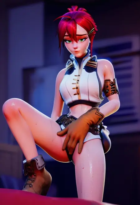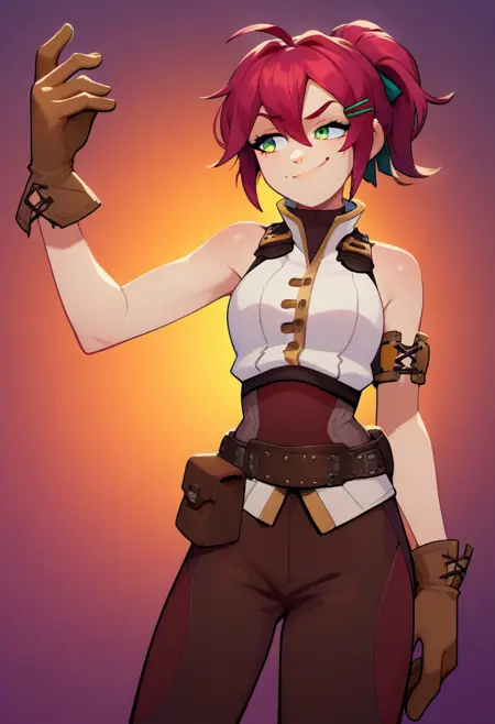 갈색 장갑, 가죽 장갑, 주머니, 벨트 주머니, 바지, 벨트, 갈색 신발, 머리리본, 어깨 노출, 소매 없는 셔츠, 셔츠, 머리 장식, 헤어클립, 팔밴드,