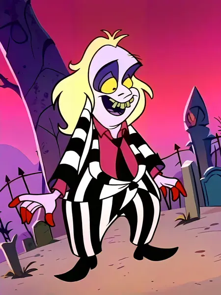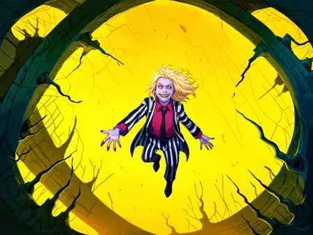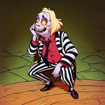 태그: 비틀주이스, 줄무늬 정장, 회색 피부, 이빨, 노란 눈, 떠다니는